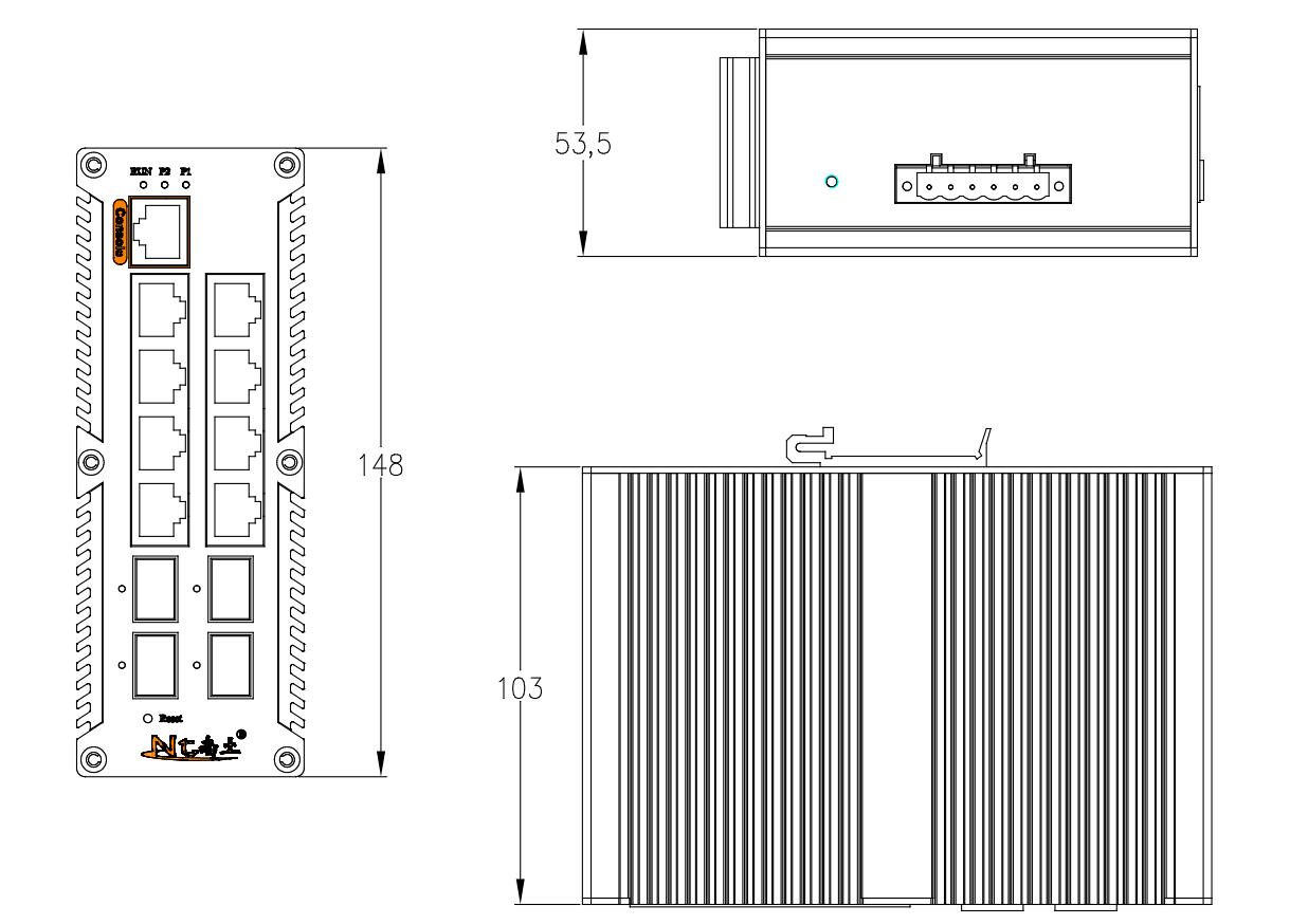 外殼:金屬材質(zhì) 安裝:DIN 卡軌式,壁掛式安裝 重量:0.85Kg 尺寸:148X103X53.5mm 重量:0.82g |