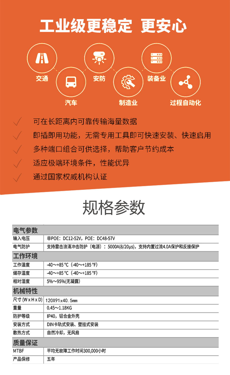 工業級(NT品牌)非網管1百光2百電,ST/單模雙纖20KM,導軌式-DC12~52V供電-寬溫(-40℃-85℃)。默認不含AC電源適配器。 |