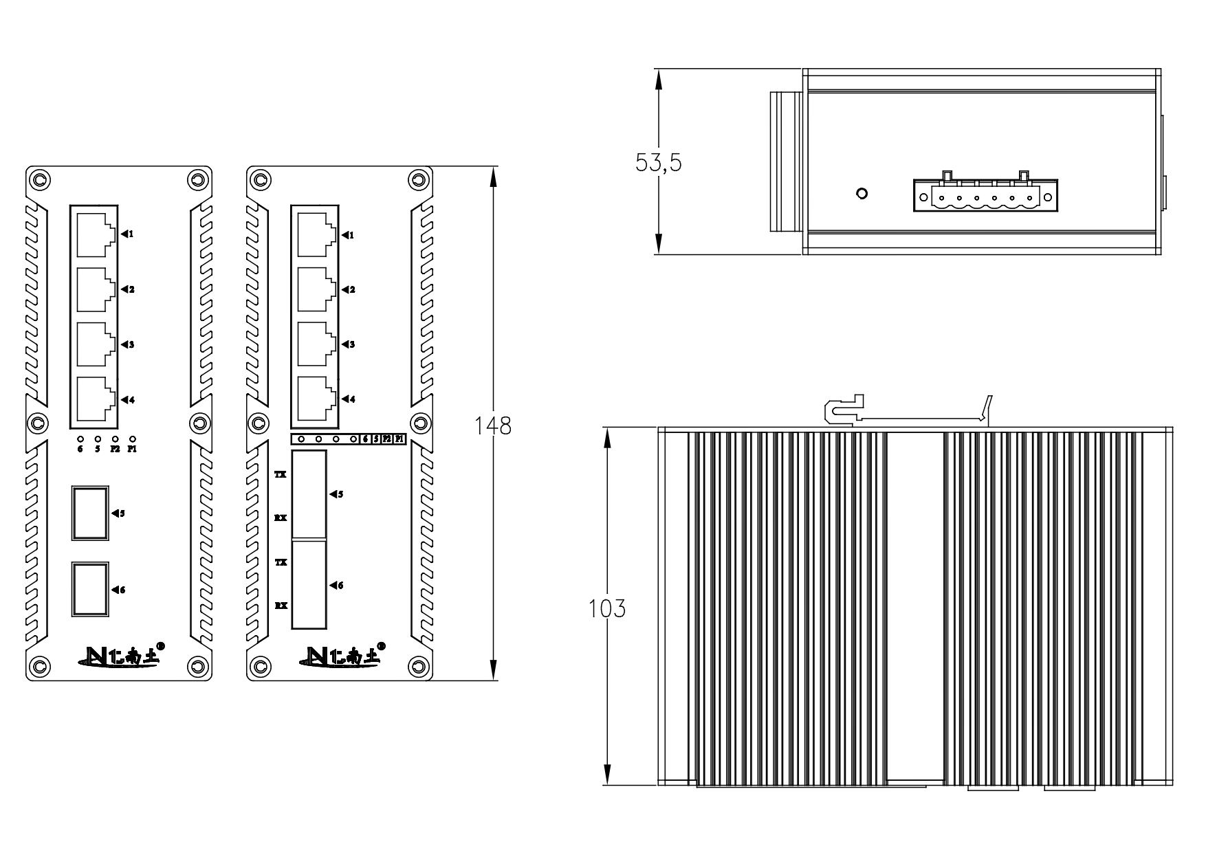 外殼:金屬材質(zhì) 安裝:DIN 卡軌式,壁掛式安裝 重量:0.64Kg 尺寸:148X103X53.5mm(長 x 寬 x 高) |