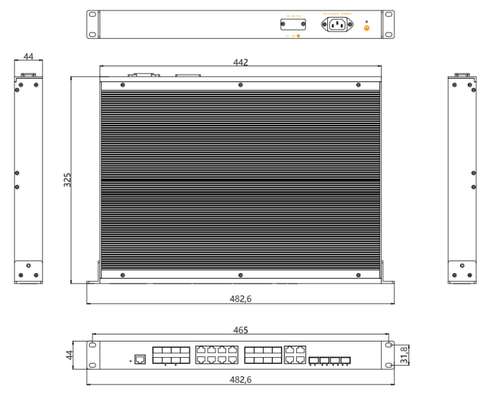 外殼:金屬材質(zhì) 安裝:DIN 卡軌式,壁掛式安裝 重量:4.0Kg 尺寸:442(L)×325(W)×44(H)mm |
