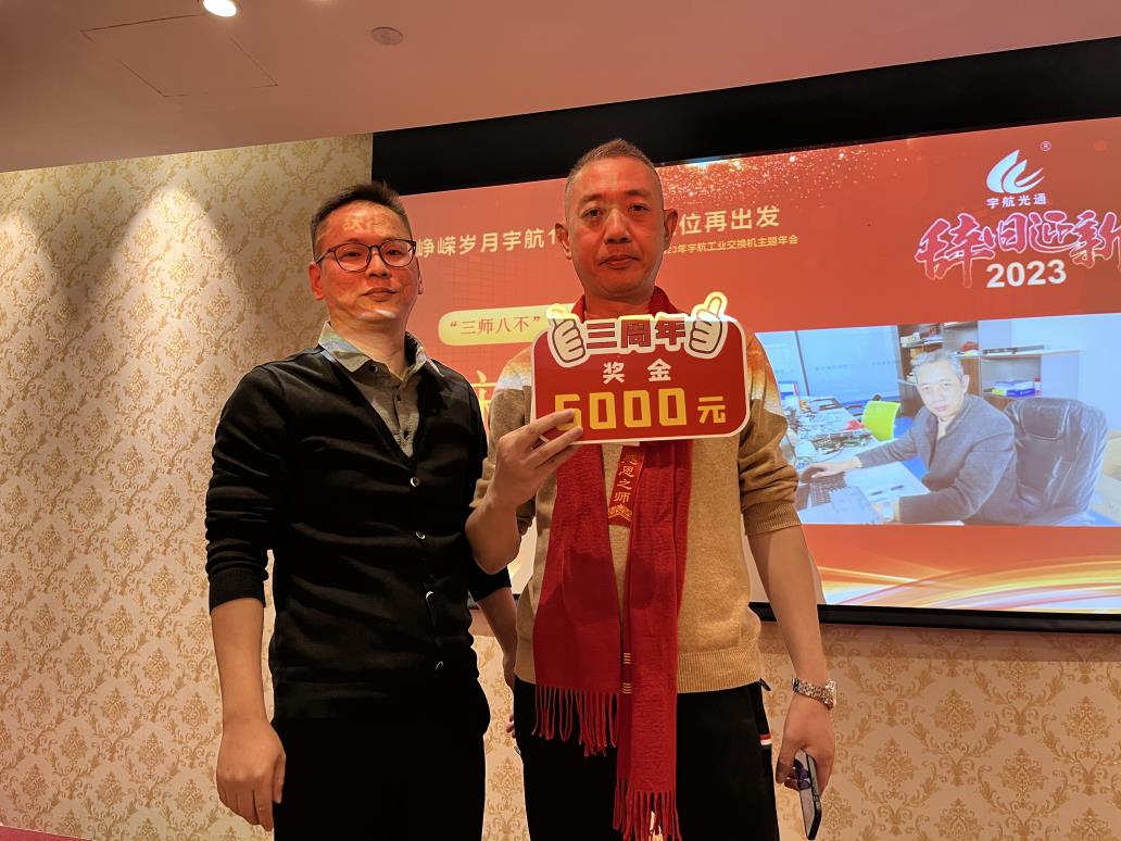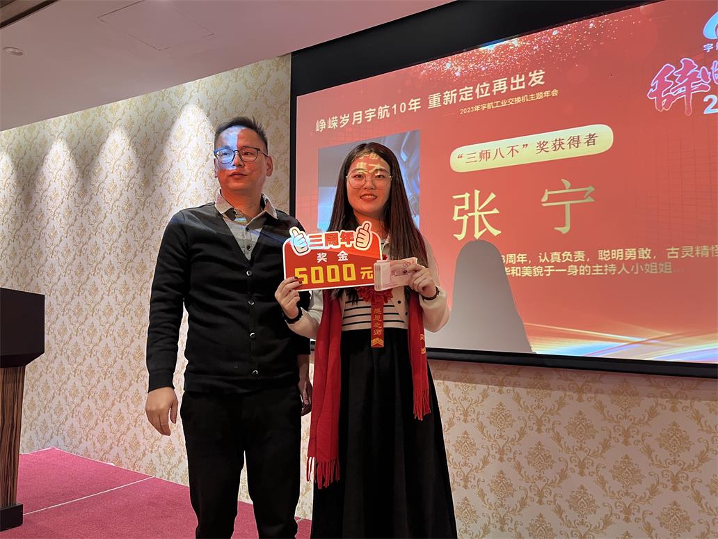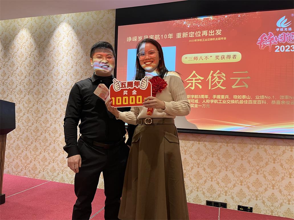 余俊云—入職宇航五周年獎,獎勵現(xiàn)金一萬元。手握重兵,穩(wěn)如泰山,業(yè)績No.1,效率No.1,可甜可咸,人稱宇航工業(yè)交換機(jī)最佳百度百科。
