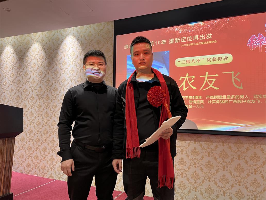 農(nóng)友飛—入職宇航五周年獎,獎勵現(xiàn)金一萬元。這是產(chǎn)線摸鍵盤最多的同事,只要有訂單下來,就認(rèn)認(rèn)真真的打好標(biāo)簽,踏實(shí)肯干、心細(xì)如發(fā)、性情直爽、壯實(shí)勇猛的廣西靚仔。