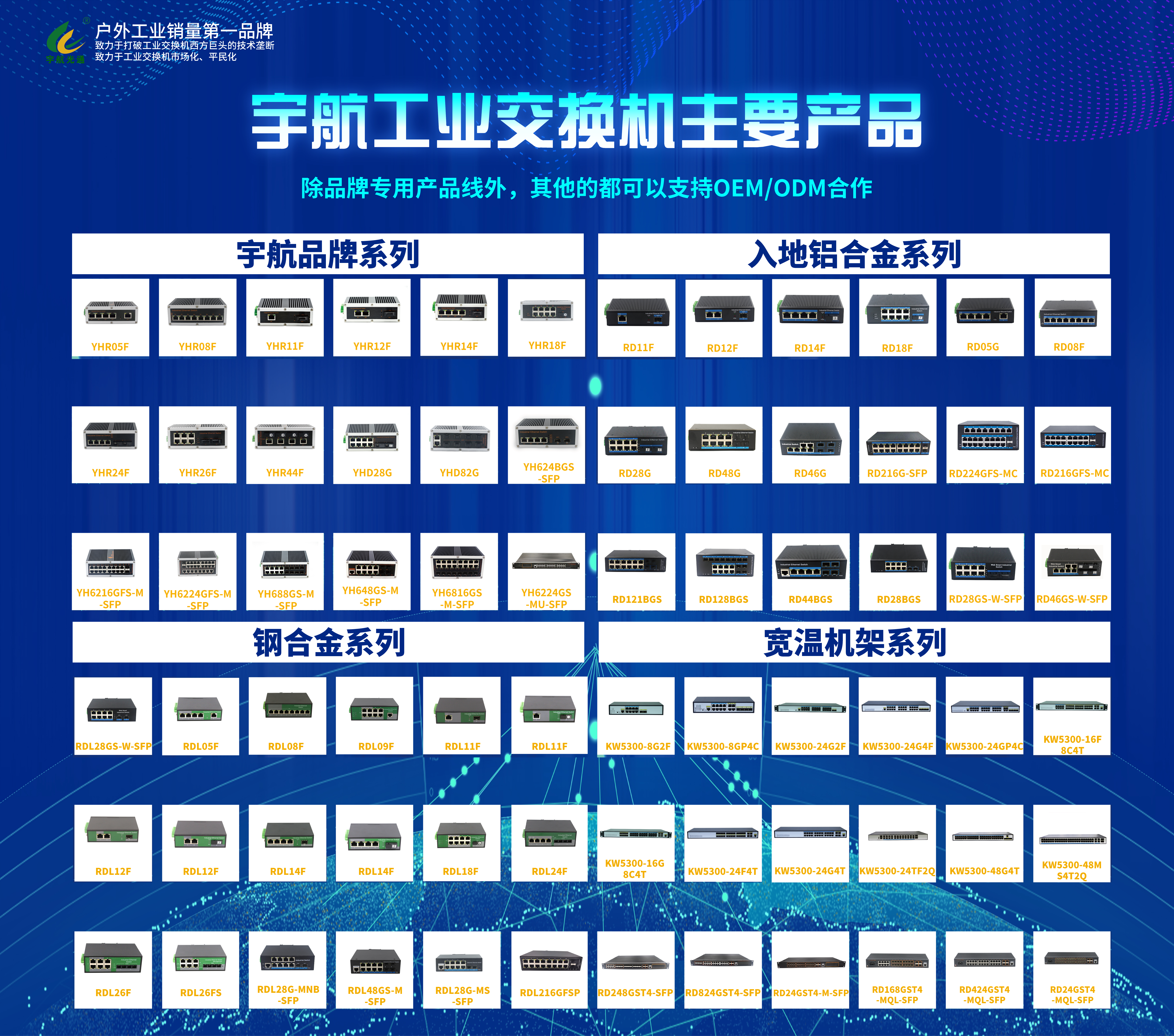 深圳市宇航光通科技有限公司自2012年成立以來(lái),是一家聚焦于工業(yè)交換機(jī)的源頭廠商,也是國(guó)產(chǎn)工業(yè)交換機(jī)最大的源頭廠商,宇航專注于工業(yè)交換機(jī)品牌市場(chǎng)和中大型客戶OEM/ODM市場(chǎng)。產(chǎn)品包括工業(yè)級(jí)收發(fā)器、工業(yè)級(jí)交換機(jī)、工業(yè)級(jí)POE交換機(jī)、二層網(wǎng)管型工業(yè)級(jí)交換機(jī)、三層網(wǎng)管型工業(yè)級(jí)萬(wàn)兆交換機(jī)、機(jī)框式插卡工業(yè)交換機(jī)、純國(guó)產(chǎn)工業(yè)交換機(jī)等。多年來(lái),宇航致力于打破工業(yè)交換機(jī)西方巨頭的技術(shù)壟斷,致力于工業(yè)交換機(jī)市場(chǎng)化、平民化。宇航,戶外工業(yè)交換機(jī)銷量第一品牌!