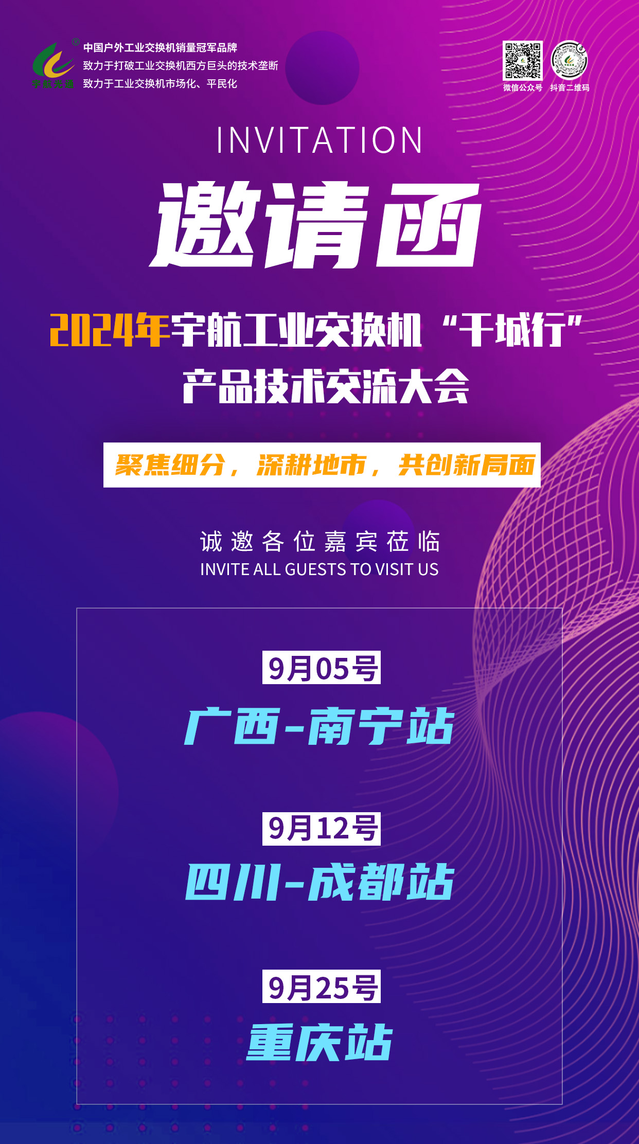 九月,宇航工業(yè)交換機(jī)將在重慶、深圳、鄭州等城市亮相行業(yè)各大展會(huì),同時(shí),為深化技術(shù)交流與合作,還將在廣西南寧、四川成都及重慶等地舉辦“2024宇航工業(yè)交換機(jī)千城行產(chǎn)品技術(shù)交流大會(huì)”,旨在通過(guò)這一系列活動(dòng),全面展示宇航工業(yè)交換機(jī)的卓越性能與創(chuàng)新應(yīng)用,促進(jìn)產(chǎn)業(yè)上下游的緊密合作,共同推動(dòng)工業(yè)通信技術(shù)的革新與發(fā)展。屆時(shí),歡迎各位領(lǐng)導(dǎo)嘉賓蒞臨現(xiàn)場(chǎng),參觀指導(dǎo)!