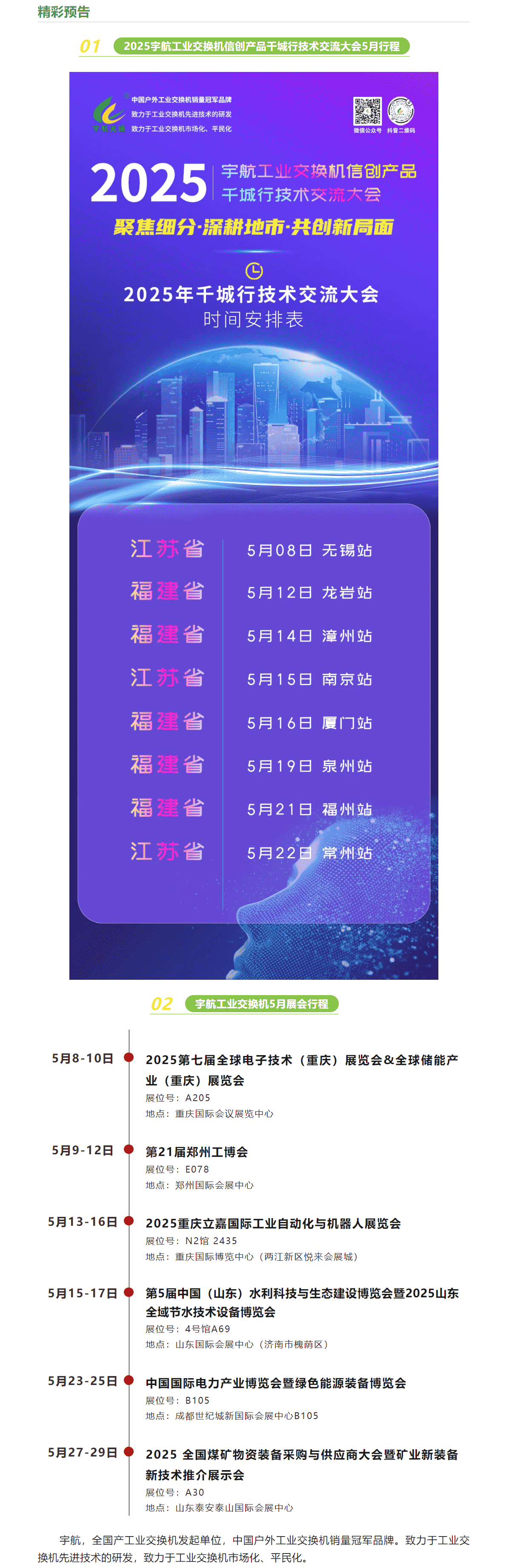 一夜熏風吹春去,萬物并秀迎夏來。2025宇航工業(yè)交換機信創(chuàng)產品干城行技術交流大會5月份將分別在浙江、福建、江蘇等省份盛大舉辦,具體涵蓋了8個地市。另外,5月份宇航工業(yè)交換機將亮相重慶儲能展、鄭州工博會、重慶自動化展、山東水展、四川電力展以及全國煤礦展等各大展會,期待您的蒞臨!