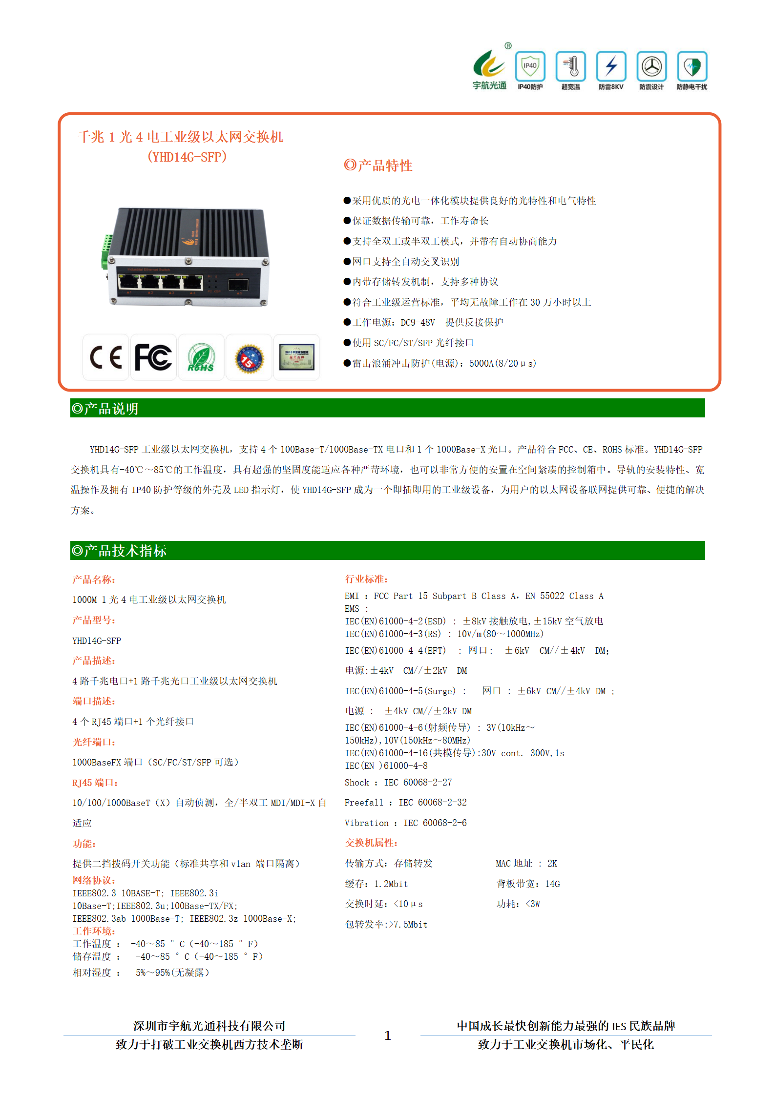 YHD14G-SFP工業級以太網交換機,支持4個100Base-T/1000Base-TX電口和1個1000Base-X光口。產品符合FCC、CE、ROHS標準。YHD14G-SFP交換機具有-40℃~85℃的工作溫度,具有超強的堅固度能適應各種嚴苛環境,也可以非常方便的安置在空間緊湊的控制箱中。導軌的安裝特性、寬溫操作及擁有IP40防護等級的外殼及LED指示燈,使YHD14G-SFP成為一個即插即用的工業級設備,為用戶的以太網設備聯網提供可靠、便捷的解決方案。