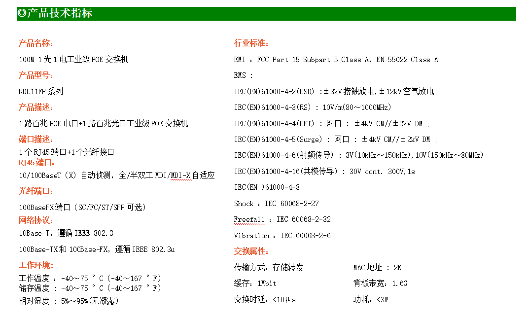 1路百兆POE電口+1路百兆SFP光口工業(yè)級以太網(wǎng)POE交換機(jī),支持1個(gè)10/100Base-TX電口和1個(gè)100Base-X光口。產(chǎn)品符合FCC、CE、ROHS標(biāo)準(zhǔn)。RD11FP系列交換機(jī)具有-40℃~80℃的工作溫度,具有超強(qiáng)的堅(jiān)固度能適應(yīng)各種嚴(yán)苛環(huán)境,也可以非常方便的安置在空間緊湊的控制箱中。導(dǎo)軌的安裝特性、寬溫操作及擁有IP40防護(hù)等級的外殼及LED指示燈,使RD11FP成為一個(gè)即插即用的工業(yè)級設(shè)備,為用戶的以太網(wǎng)設(shè)備聯(lián)網(wǎng)提供可靠、便捷的解決方案。