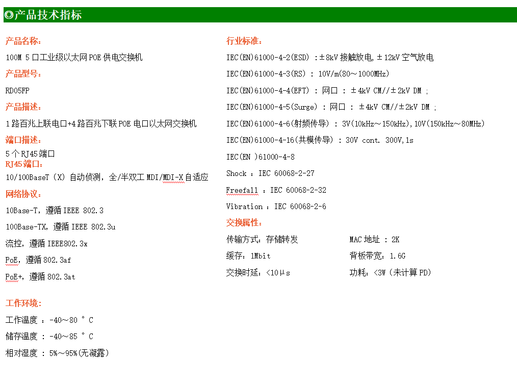 1路百兆上聯電口+4路百兆下聯電口工業級以太網POE交換機,支持1個10/100Base-TX上聯電口和4個10Base-T/100Base-TX下聯POE電口。產品符合FCC、CE、ROHS標準。RD05FP交換機具有-40℃~80℃的工作溫度,具有超強的堅固度能適應各種嚴苛環境,也可以非常方便的安置在空間緊湊的控制箱中。導軌的安裝特性、寬溫操作及擁有IP40防護等級的外殼及LED指示燈,使RD05FP成為一個即插即用的工業級設備,為用戶的以太網設備聯網提供可靠、便捷的解決方案。
