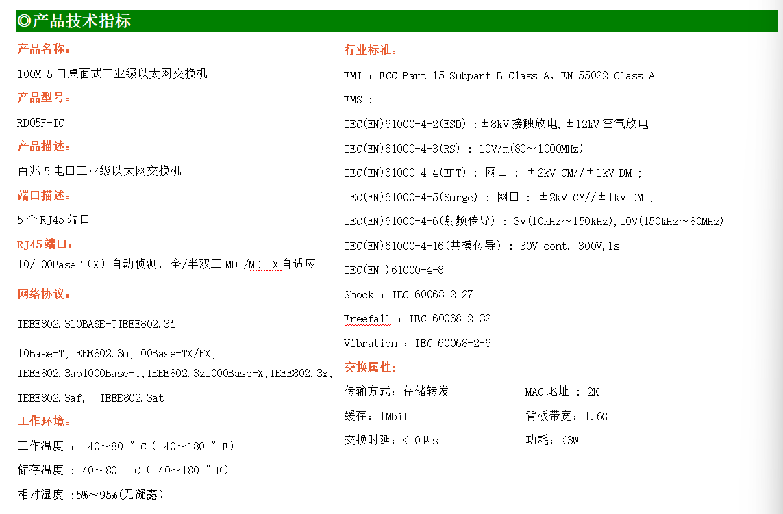 桌面式百兆5電口工業級以太網交換機,支持5個10/100Base-TX自適應電口。產品符合FCC、CE、ROHS標準。RD05F-IC交換機具有-40℃~80℃的工作溫度,具有超強的堅固度能適應各種嚴苛環境,也可以非常方便的安置在空間緊湊的控制箱中。導軌的安裝特性、寬溫操作及擁有IP40防護等級的外殼及LED指示燈,使RD05F-IC成為一個即插即用的工業級設備,為用戶的以太網設備聯網提供可靠、便捷的解決方案。