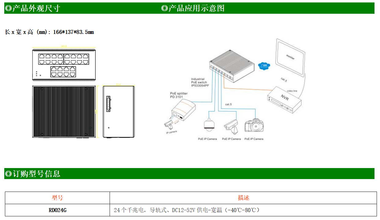 24路千兆電口工業(yè)級(jí)以太網(wǎng)交換機(jī),支持24個(gè)10Base-T/100Base-T/1000Base-TX電口。產(chǎn)品符合FCC、CE、ROHS標(biāo)準(zhǔn)。RD024G交換機(jī)具有-40℃~80℃的工作溫度,具有超強(qiáng)的堅(jiān)固度能適應(yīng)各種嚴(yán)苛環(huán)境,也可以非常方便的安置在空間緊湊的控制箱中。機(jī)架式安裝特性、寬溫操作及擁有IP40防護(hù)等級(jí)的外殼及LED指示燈,使RD224G-SFP成為一個(gè)即插即用的工業(yè)級(jí)設(shè)備,為用戶(hù)的以太網(wǎng)設(shè)備聯(lián)網(wǎng)提供可靠、便捷的解決方案。