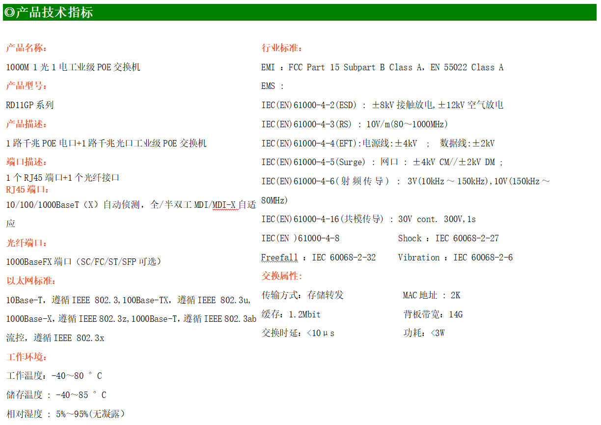 1路千兆POE電口+1路千兆FX光口工業級以太網POE交換機,支持1個10/100Base-TX電口和1個100Base-X光口。產品符合FCC、CE、ROHS標準。RD11GP系列交換機具有-40℃~80℃的工作溫度,具有超強的堅固度能適應各種嚴苛環境,也可以非常方便的安置在空間緊湊的控制箱中。導軌的安裝特性、寬溫操作及擁有IP40防護等級的外殼及LED指示燈,使RD11GP成為一個即插即用的工業級設備,為用戶的以太網設備聯網提供可靠、便捷的解決方案。
