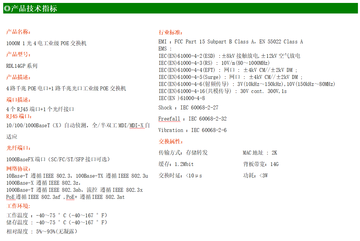 4路千兆POE電口+1路千兆FX光口工業(yè)級(jí)以太網(wǎng)POE交換機(jī),支持4個(gè)10/100/1000Base-TX電口和1個(gè)1000Base-X光口。產(chǎn)品符合FCC、CE、ROHS標(biāo)準(zhǔn)。RDL14GP系列交換機(jī)具有-40℃~75℃的工作溫度,具有超強(qiáng)的堅(jiān)固度能適應(yīng)各種嚴(yán)苛環(huán)境,也可以非常方便的安置在空間緊湊的控制箱中。導(dǎo)軌的安裝特性、寬溫操作及擁有IP40防護(hù)等級(jí)的外殼及LED指示燈,使RDL14GP成為一個(gè)即插即用的工業(yè)級(jí)設(shè)備,為用戶的以太網(wǎng)設(shè)備聯(lián)網(wǎng)提供可靠、便捷的解決方案。