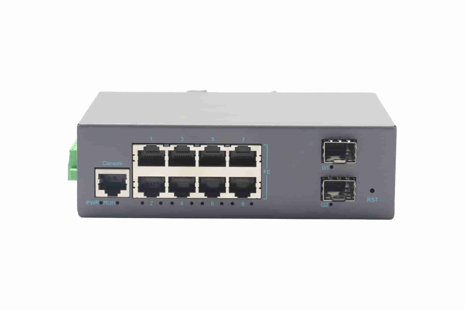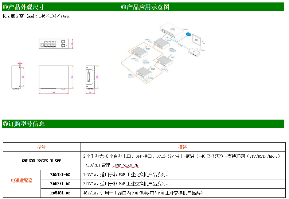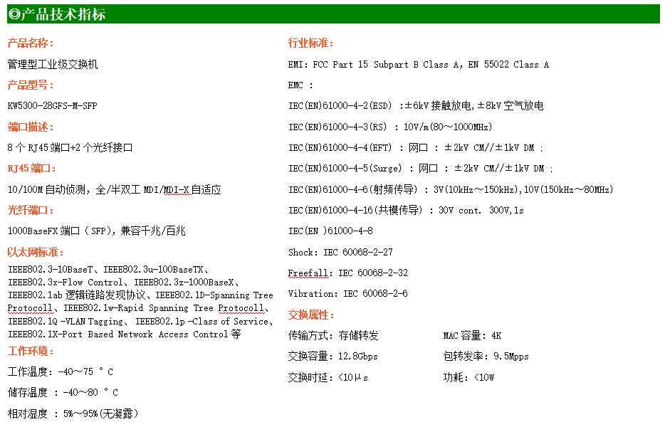 KW5300-28GFS-M-SFP是網管型工業以太網交換機,產品符合FCC、CE、RoHS標準。支持2個千兆光口和8個百兆電口;支持工業現場所需的以太網二層協議,保證通信網絡的穩定性;該系列交換機采用低功耗、無風扇設計,確保無噪聲干擾,同時支持-40~75℃工作溫度和良好的EMC電磁兼容性能,保證在惡劣的工業環境中保持穩定的工作,為工廠自動化,智能交通,視頻監控等工業應用領域組建快速穩定的網絡終端接入網絡提供安全可靠的解決方案。