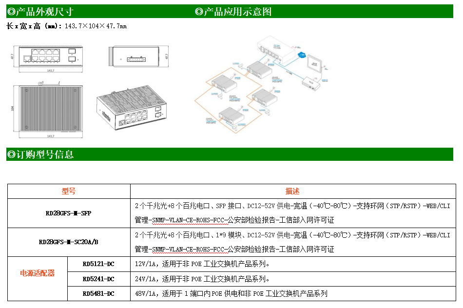 RD28GFS-M-SFP是網(wǎng)管型工業(yè)以太網(wǎng)交換機(jī),產(chǎn)品符合FCC、CE、RoHS標(biāo)準(zhǔn)。支持2個(gè)千兆光口和8個(gè)百兆電口;支持工業(yè)現(xiàn)場(chǎng)所需的以太網(wǎng)二層協(xié)議,保證通信網(wǎng)絡(luò)的穩(wěn)定性;該系列交換機(jī)采用低功耗、無風(fēng)扇設(shè)計(jì),確保無噪聲干擾,同時(shí)支持-40~80℃工作溫度和良好的EMC電磁兼容性能,保證在惡劣的工業(yè)環(huán)境中保持穩(wěn)定的工作,為工廠自動(dòng)化,智能交通,視頻監(jiān)控等工業(yè)應(yīng)用領(lǐng)域組建快速穩(wěn)定的網(wǎng)絡(luò)終端接入網(wǎng)絡(luò)提供安全可靠的解決方案。