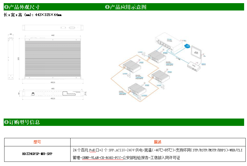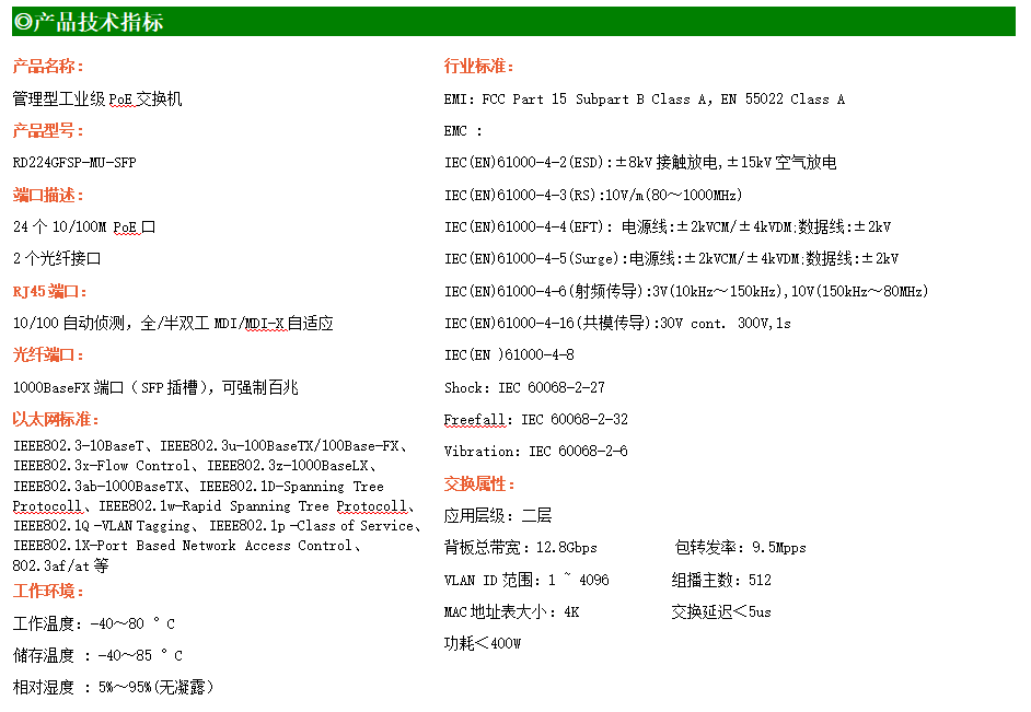 RD224GFSP-MU-SFP是網管型工業以太網PoE交換機,產品符合FCC、CE、RoHS標準。可提供24個百兆PoE端口,所有PoE端口符合IEEE802.3af/at標準。支持工業現場所需的以太網二層協議,保證通信網絡的穩定性;該系列交換機采用低功耗、無風扇設計,確保無噪聲干擾,同時支持-40~85℃工作溫度和良好的EMC電磁兼容性能,保證在惡劣的工業環境中保持穩定的工作,為工廠自動化,智能交通,視頻監控等工業應用領域組建快速穩定的網絡終端接入網絡提供安全可靠的解決方案。