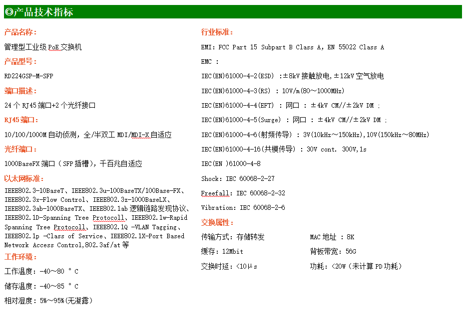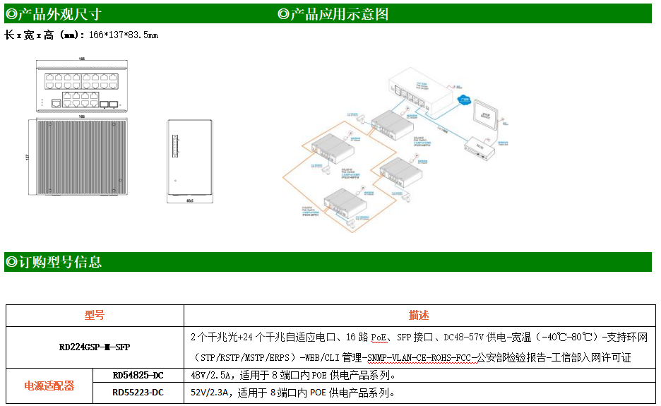 RD224GS-M-SFP是網(wǎng)管型工業(yè)以太網(wǎng)交換機(jī),產(chǎn)品符合FCC、CE、RoHS標(biāo)準(zhǔn)。支持2個(gè)千兆光口和24個(gè)千兆電口,其中16個(gè)電口支持PoE供電;支持工業(yè)現(xiàn)場(chǎng)所需的以太網(wǎng)二層協(xié)議,保證通信網(wǎng)絡(luò)的穩(wěn)定性;該系列交換機(jī)采用低功耗、無(wú)風(fēng)扇設(shè)計(jì),確保無(wú)噪聲干擾,同時(shí)支持-40~80℃工作溫度和良好的EMC電磁兼容性能,保證在惡劣的工業(yè)環(huán)境中保持穩(wěn)定的工作,為工廠自動(dòng)化,智能交通,視頻監(jiān)控等工業(yè)應(yīng)用領(lǐng)域組建快速穩(wěn)定的網(wǎng)絡(luò)終端接入網(wǎng)絡(luò)提供安全可靠的解決方案。