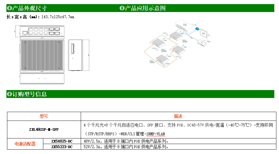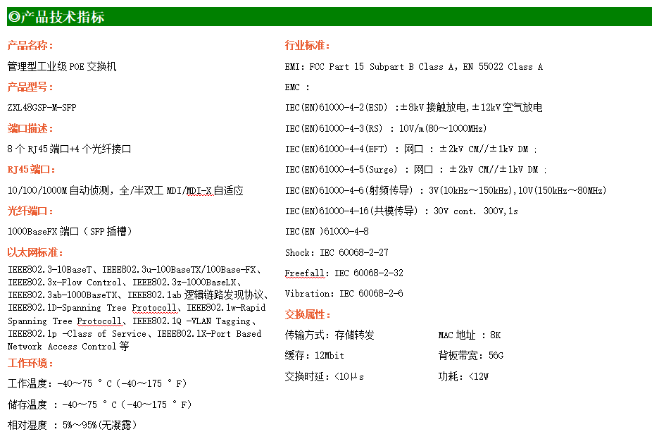 ZXL48GSP-M-SFP是網管型工業以太網POE交換機,產品符合FCC、CE、RoHS標準。支持4個千兆光口和8個千兆電口;支持工業現場所需的以太網二層協議,保證通信網絡的穩定性;該系列交換機采用低功耗、無風扇設計,確保無噪聲干擾,同時支持-40~75℃工作溫度和良好的EMC電磁兼容性能,保證在惡劣的工業環境中保持穩定的工作,為工廠自動化,智能交通,視頻監控等工業應用領域組建快速穩定的網絡終端接入網絡提供安全可靠的解決方案。