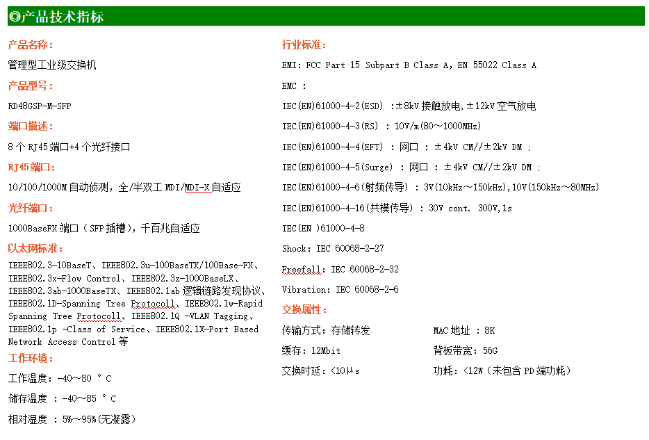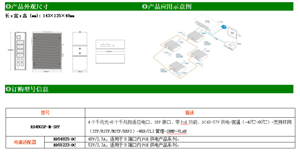RD48GSP-M是網(wǎng)管型工業(yè)級(jí)以太網(wǎng)PoE交換機(jī),提供4個(gè)千兆光口和8個(gè)千兆電口支持8路PoE,支持工業(yè)現(xiàn)場(chǎng)所需的以太網(wǎng)二層協(xié)議,保證通信網(wǎng)絡(luò)的穩(wěn)定性;該系列交換機(jī)采用低功耗、無風(fēng)扇設(shè)計(jì),確保無噪聲干擾,同時(shí)支持-40~80℃工作溫度和良好的EMC電磁兼容性能,保證在惡劣的工業(yè)環(huán)境中保持穩(wěn)定的工作,為工廠自動(dòng)化,智能交通,視頻監(jiān)控等工業(yè)應(yīng)用領(lǐng)域組建快速穩(wěn)定的網(wǎng)絡(luò)終端接入網(wǎng)絡(luò)提供安全可靠的解決方案。