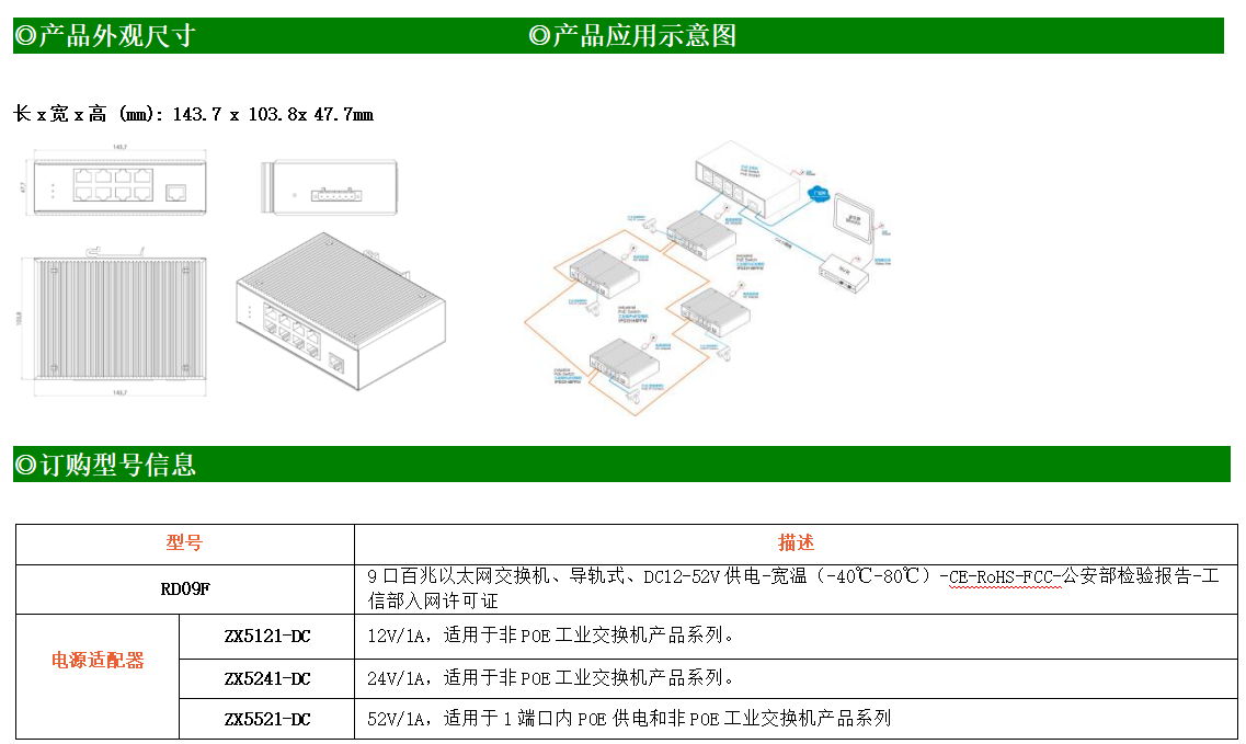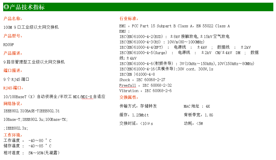 9路百兆電口工業(yè)級以太網(wǎng)交換機,支持9個10Base-T/100Base-TX電口。產(chǎn)品符合FCC、CE、ROHS標(biāo)準(zhǔn)。RD09F交換機具有-40℃~80℃的工作溫度,具有超強的堅固度能適應(yīng)各種嚴(yán)苛環(huán)境,也可以非常方便的安置在空間緊湊的控制箱中。導(dǎo)軌的安裝特性、寬溫操作及擁有IP40防護等級的外殼及LED指示燈,使RD09F成為一個即插即用的工業(yè)級設(shè)備,為用戶的以太網(wǎng)設(shè)備聯(lián)網(wǎng)提供可靠、便捷的解決方案。