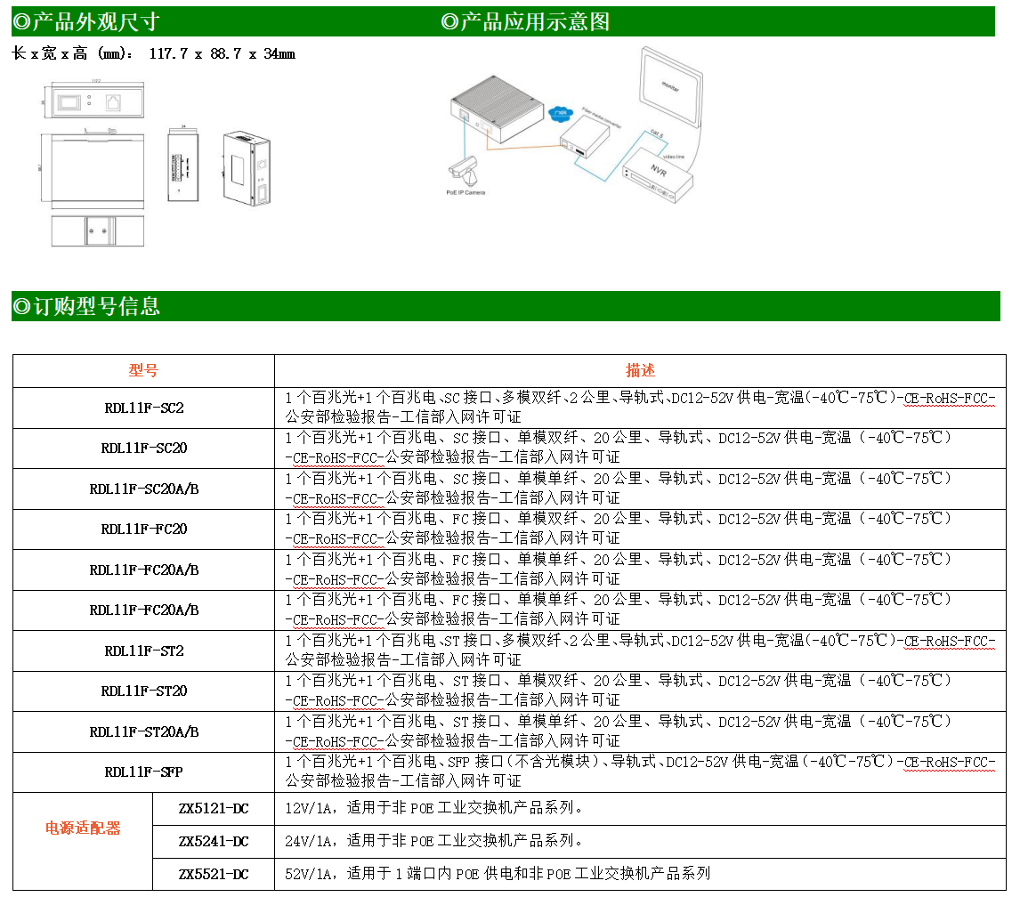 1路百兆電口+1路百兆FX光口工業級以太網交換機,支持1個10Base-T/100Base-TX電口和1個100Base-X(SC/ST/FC)光口。產品符合FCC、CE、ROHS標準。RDL11F系列交換機具有-40℃~75℃的工作溫度,具有超強的堅固度能適應各種嚴苛環境,也可以非常方便的安置在空間緊湊的控制箱中。導軌的安裝特性、寬溫操作及擁有IP40防護等級的外殼及LED指示燈,使RDL11F成為一個即插即用的工業級設備,為用戶的以太網設備聯網提供可靠、便捷的解決方案。