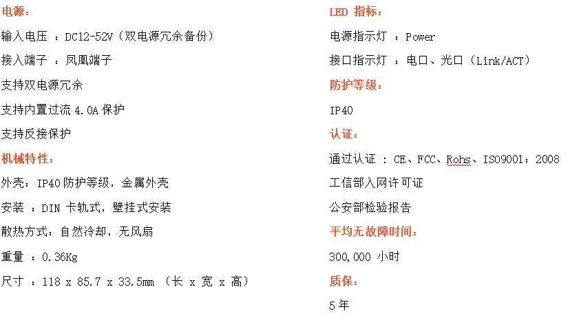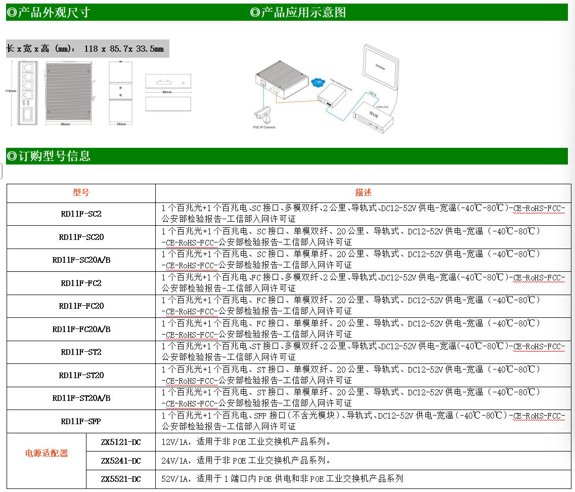 1路百兆電口+1路百兆FX光口工業級以太網交換機,支持1個10Base-T/100Base-TX電口和1個100Base-X光口。產品符合FCC、CE、ROHS標準。RD11F系列交換機具有-40℃~80℃的工作溫度,具有超強的堅固度能適應各種嚴苛環境,也可以非常方便的安置在空間緊湊的控制箱中。導軌的安裝特性、寬溫操作及擁有IP40防護等級的外殼及LED指示燈,使RD11F成為一個即插即用的工業級設備,為用戶的以太網設備聯網提供可靠、便捷的解決方案。