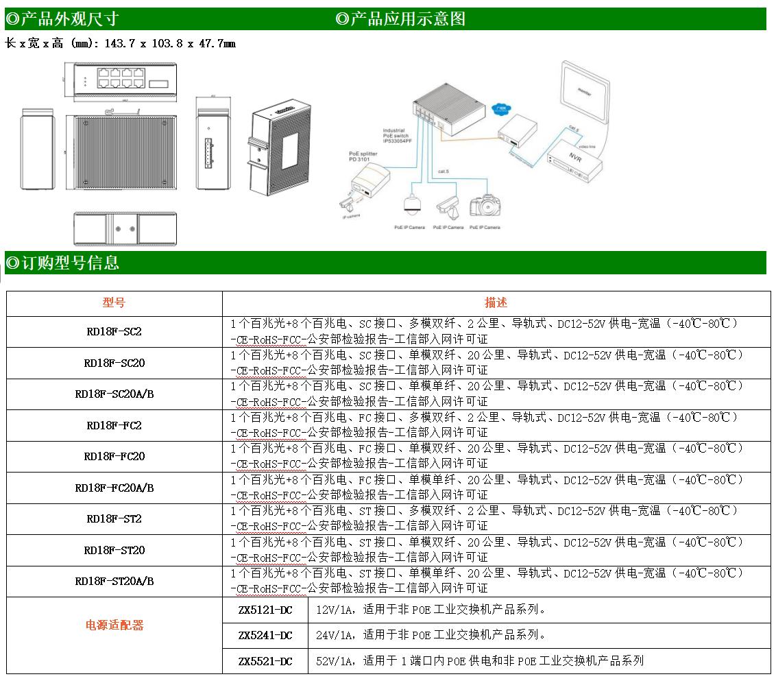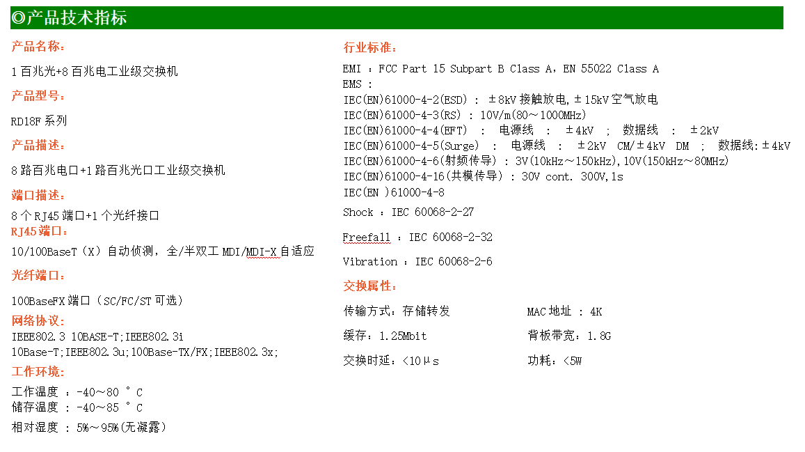 8路百兆電口+1路百兆FX光口工業級以太網交換機,支持8個10/100Base-TX電口和1個100Base-X光口。產品符合FCC、CE、ROHS標準。RDL18F交換機具有-40℃~75℃的工作溫度,具有超強的堅固度能適應各種嚴苛環境,也可以非常方便的安置在空間緊湊的控制箱中。導軌的安裝特性、寬溫操作及擁有IP40防護等級的外殼及LED指示燈,使RDL18F成為一個即插即用的工業級設備,為用戶的以太網設備聯網提供可靠、便捷的解決方案。