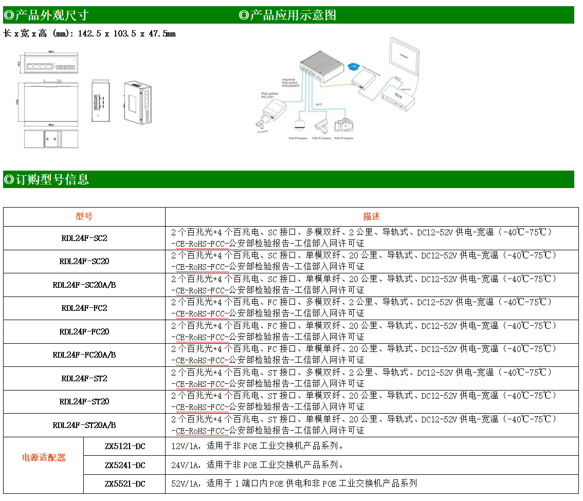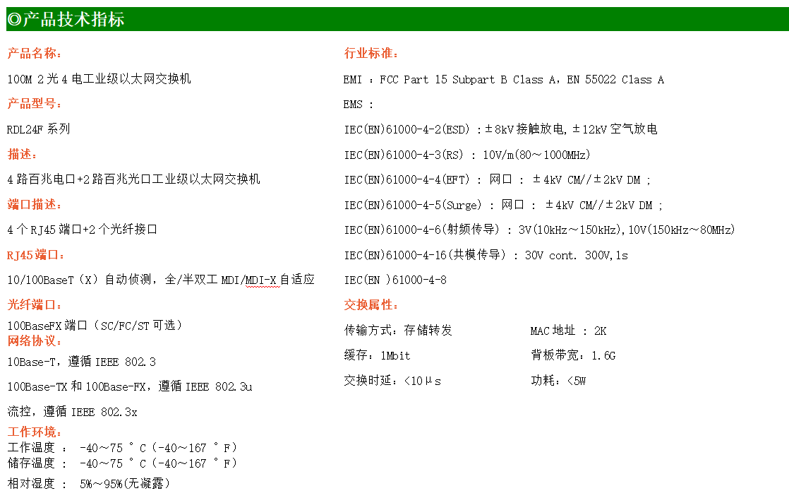 4路百兆電口+2路百兆FX光口工業(yè)級以太網(wǎng)交換機,支持4個10Base-T/100Base-TX電口和2個100Base-X光口。產(chǎn)品符合FCC、CE、ROHS標(biāo)準(zhǔn)。RDL24F系列交換機具有-40℃~75℃的工作溫度,具有超強的堅固度能適應(yīng)各種嚴苛環(huán)境,也可以非常方便的安置在空間緊湊的控制箱中。導(dǎo)軌的安裝特性、寬溫操作及擁有IP40防護等級的外殼及LED指示燈,使RDL24F成為一個即插即用的工業(yè)級設(shè)備,為用戶的以太網(wǎng)設(shè)備聯(lián)網(wǎng)提供可靠、便捷的解決方案。