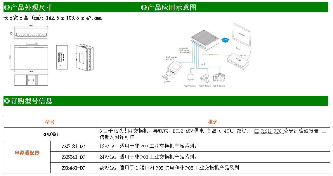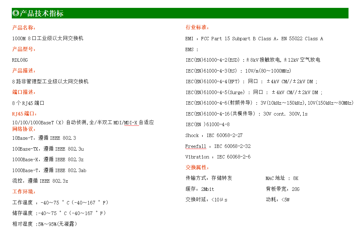 8路千兆電口工業(yè)級以太網交換機,支持8個10Base-T/100Base-T/1000Base-TX電口。產品符合FCC、CE、ROHS標準。RD08G交換機具有-40℃~80℃的工作溫度,具有超強的堅固度能適應各種嚴苛環(huán)境,也可以非常方便的安置在空間緊湊的控制箱中。導軌的安裝特性、寬溫操作及擁有IP40防護等級的外殼及LED指示燈,使RD08G成為一個即插即用的工業(yè)級設備,為用戶的以太網設備聯網提供可靠、便捷的解決方案。