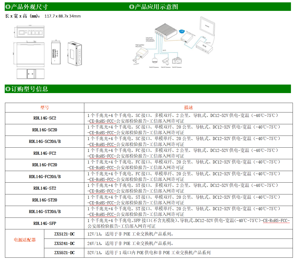4路千兆電口+1路千兆FX光口工業級以太網交換機,支持4個100Base-T/1000Base-TX電口和1個1000Base-X光口。產品符合FCC、CE、ROHS標準。RDL14G系列交換機具有-40℃~75℃的工作溫度,具有超強的堅固度能適應各種嚴苛環境,也可以非常方便的安置在空間緊湊的控制箱中。導軌的安裝特性、寬溫操作及擁有IP40防護等級的外殼及LED指示燈,使RDL14G系列成為一個即插即用的工業級設備,為用戶的以太網設備聯網提供可靠、便捷的解決方案。