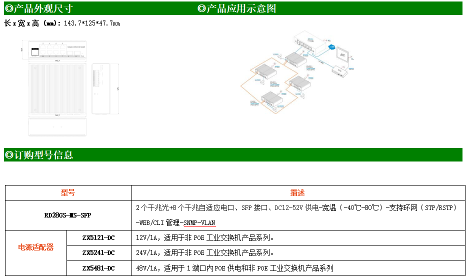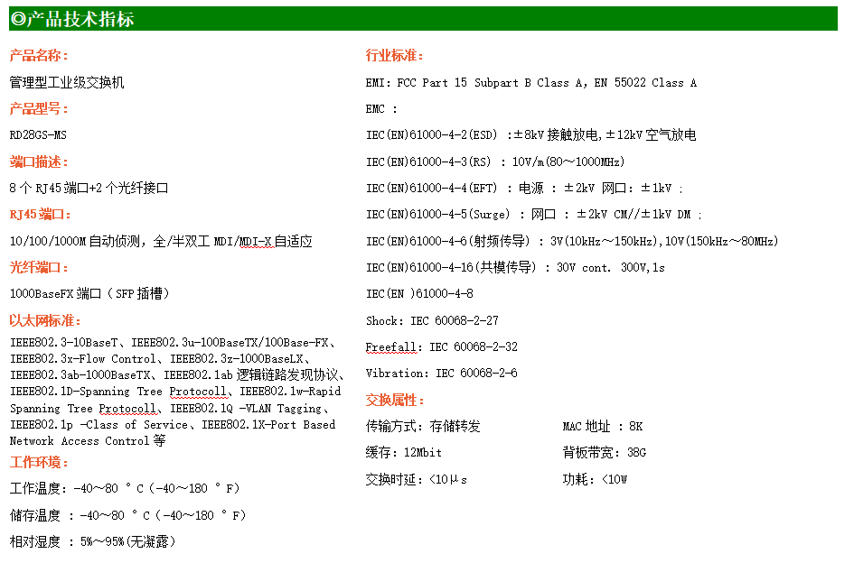 RD28GS-MS是網(wǎng)管型工業(yè)以太網(wǎng)交換機,產(chǎn)品符合FCC、CE、RoHS標準。支持2個千兆光口和8個千兆電口;支持工業(yè)現(xiàn)場所需的以太網(wǎng)二層協(xié)議,保證通信網(wǎng)絡(luò)的穩(wěn)定性;該系列交換機采用低功耗、無風扇設(shè)計,確保無噪聲干擾,同時支持-40~80℃工作溫度和良好的EMC電磁兼容性能,保證在惡劣的工業(yè)環(huán)境中保持穩(wěn)定的工作,為工廠自動化,智能交通,視頻監(jiān)控等工業(yè)應用領(lǐng)域組建快速穩(wěn)定的網(wǎng)絡(luò)終端接入網(wǎng)絡(luò)提供安全可靠的解決方案。