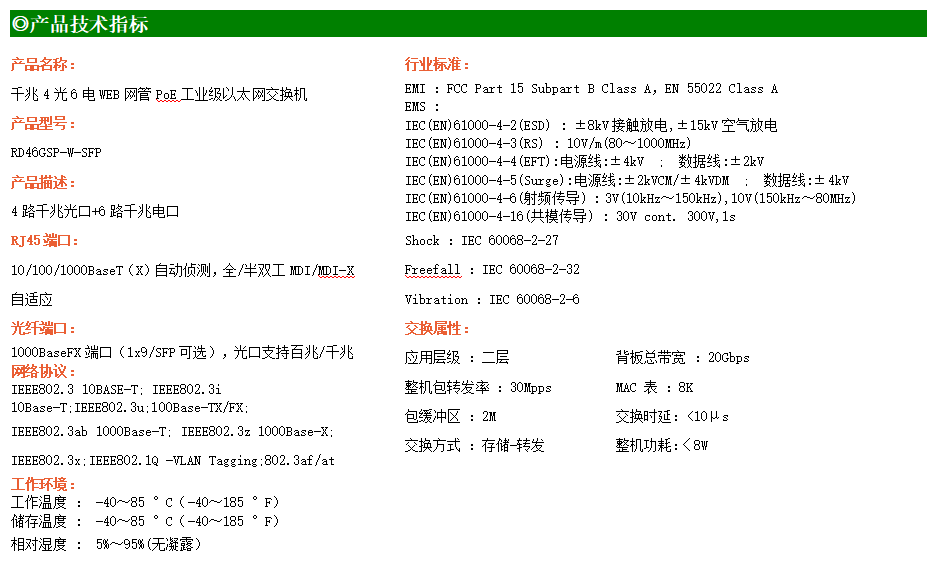 RD46GSP-W-SFP系列WEB網管工業級以太網交換機,產品符合FCC、CE、ROHS標準,支持工業現場所需的以太網二層協議,保證通信網絡的穩定性。該系列交換機采用低功耗、無風扇設計,確保無噪聲干擾,同時支持-40~85℃工作溫度和良好的EMC電磁兼容性能,保證在惡劣的工業環境中保持穩定的工作,為工廠自動化,智能交通,視頻監控等工業應用領域組建快速穩定的網絡終端接入網絡提供安全可靠的解決方案。