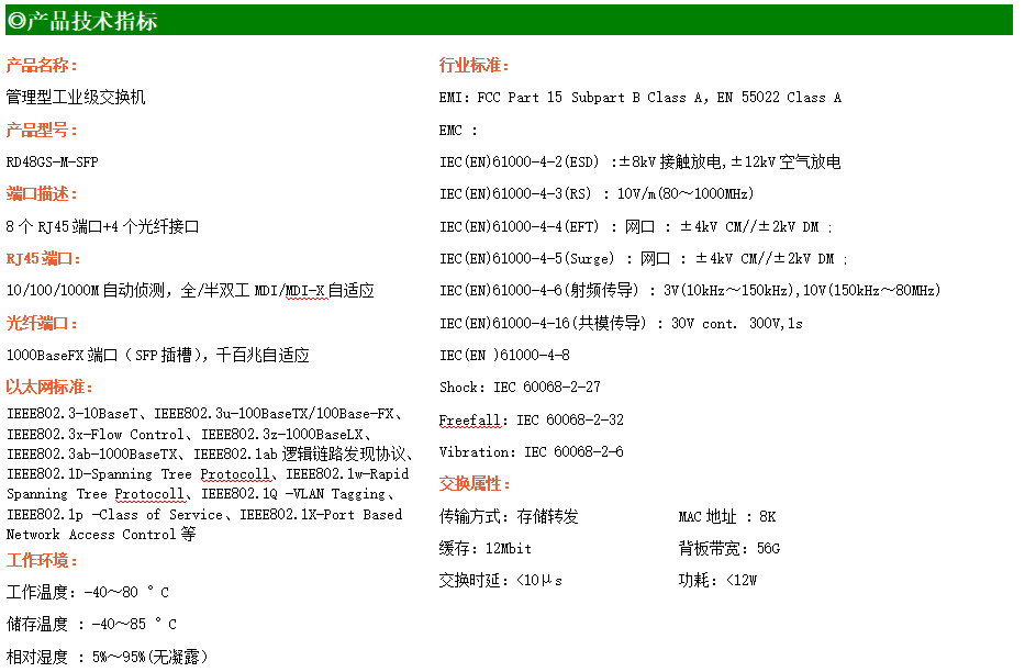 RD48GS-M-SFP是網管型工業以太網交換機,產品支持4個千兆光口和8個千兆電口;支持工業現場所需的以太網二層協議,保證通信網絡的穩定性;該系列交換機采用低功耗、無風扇設計,確保無噪聲干擾,同時支持-40~80℃工作溫度和良好的EMC電磁兼容性能,保證在惡劣的工業環境中保持穩定的工作,為工廠自動化,智能交通,視頻監控等工業應用領域組建快速穩定的網絡終端接入網絡提供安全可靠的解決方案。
