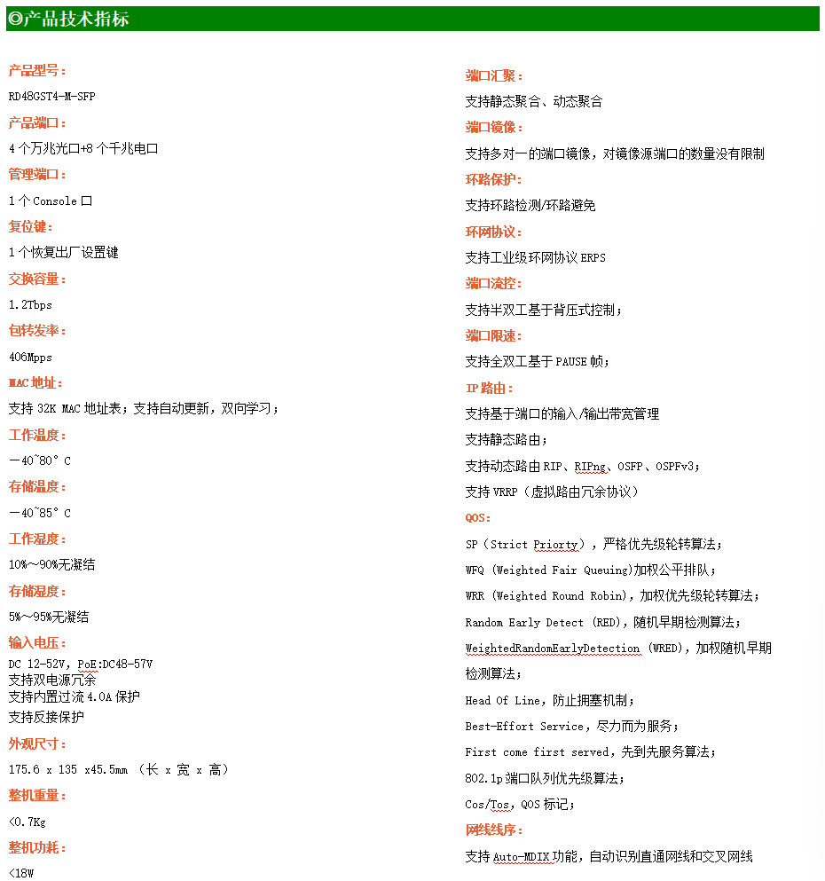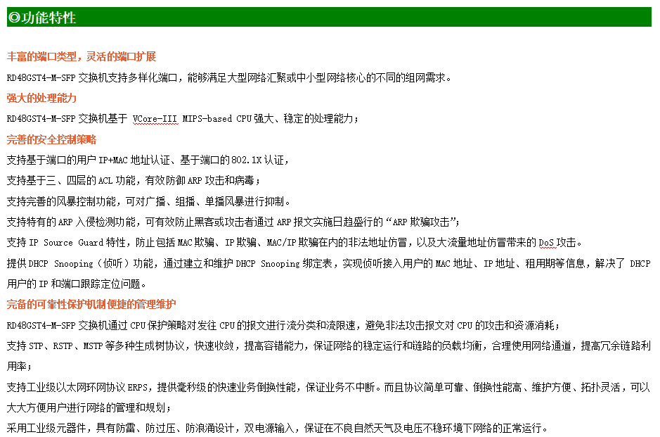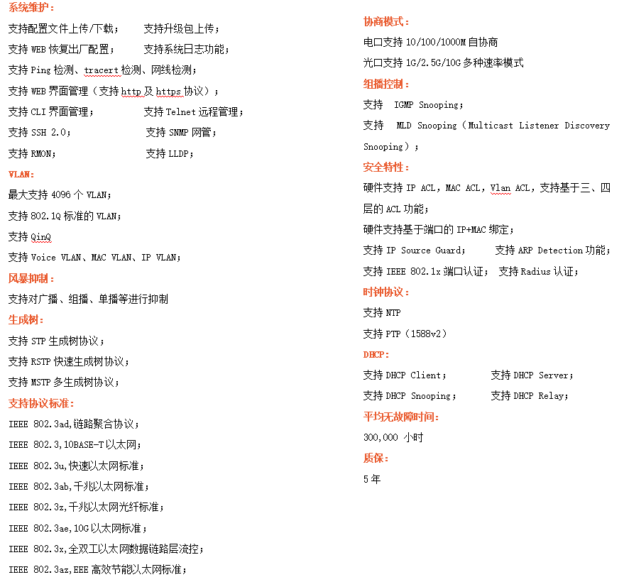 ●網(wǎng)絡(luò)冗余:支持STP/RSTP/MSTP,支持ERPS(自愈時(shí)間<20ms)