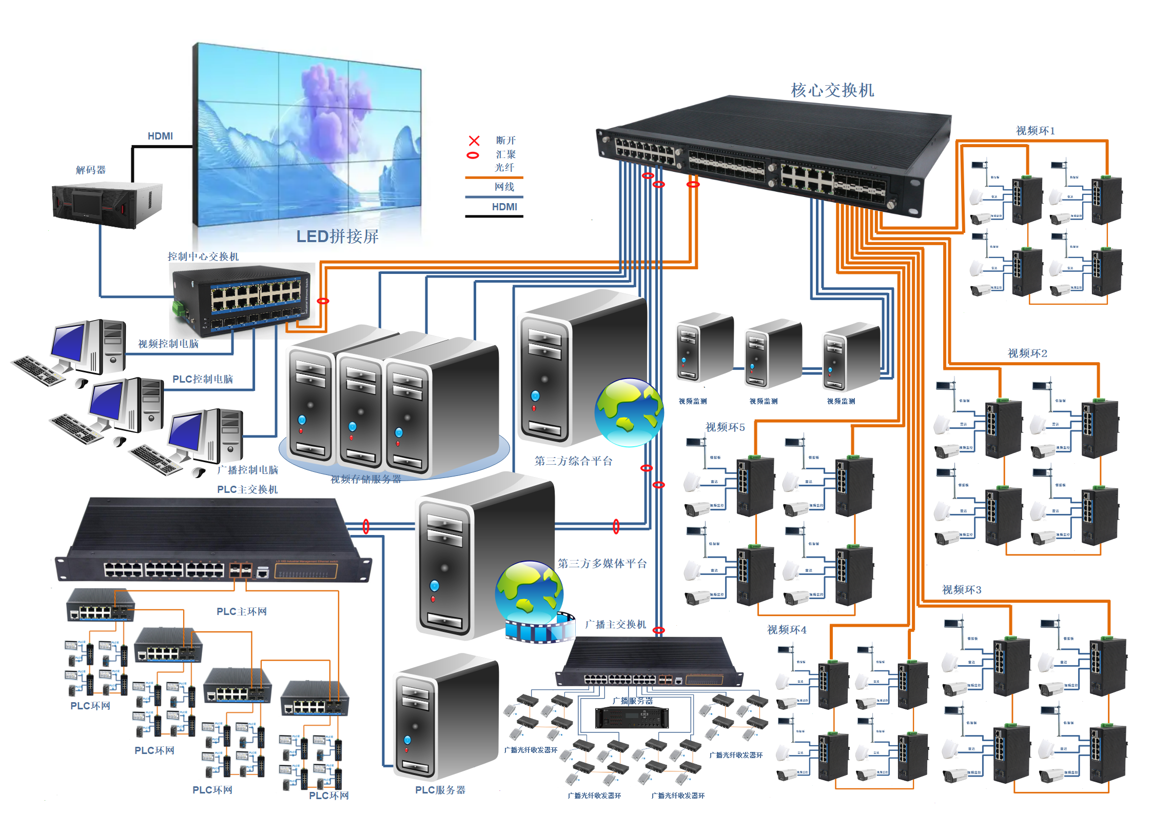 整個方案通過HDMI視頻傳輸、光纖通信和以太網(wǎng)相結(jié)合的方式,實現(xiàn)視頻監(jiān)控、工業(yè)控制、廣播通信等多系統(tǒng)的統(tǒng)一接入和集中管理。